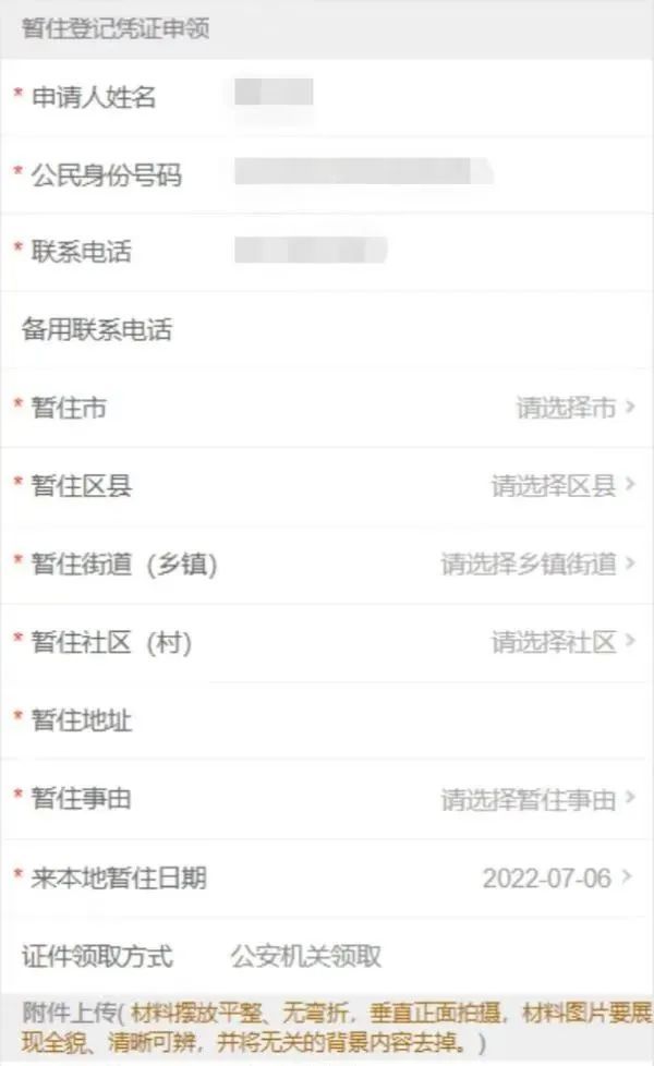 进入“暂住登记申报”模块,依照页面提示填写有关信息、拍照上传证明材料,提交办件申请。