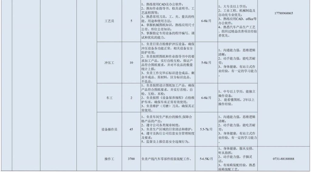 1. 生产操作工:高中及以上学历,具备良好的沟通能力,身体健康,能适应倒班工作。 2. 设备维护工程师:大专及以上学历,机械、电气等相关专业,具备设备维护经验。 3. 质量工程师:大专及以上学历,质量工程、质量管理等相关专业,具备质量管理体系知识。 4. 采购专员:大专及以上学历,采购、供应链管理等相关专业,具备良好的沟通能力和谈判技巧。 5. 人力资源专员:大专及以上学历,人力资源管理、劳动与社会保障等相关专业,具备招聘、培训、薪酬福利等方面的经验。 6. 财务专员:大专及以上学历,会计、财务管理等相关专业,具备良好的财务分析能力。 7. 市场营销专员:大专及以上学历,市场营销、广告等相关专业,具备市场推广、活动策划等方面的经验。 8. 技术研发工程师:本科及以上学历,汽车工程、机械工程等相关专业,具备良好的创新能力和团队协作精神。 9. 销售工程师:大专及以上学历,市场营销、汽车工程等相关专业,