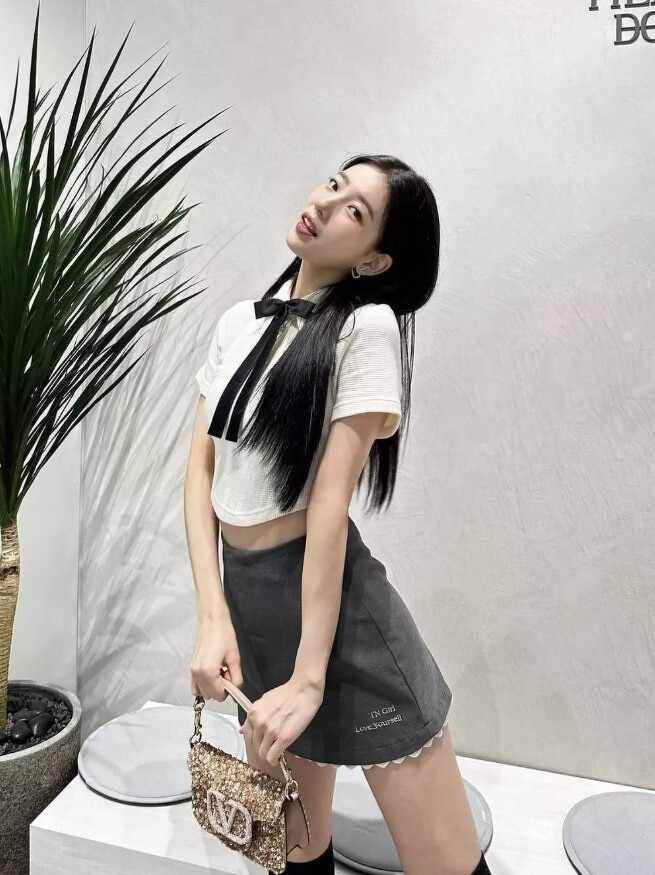 Valentino Vlogo 手袋融合了V logo元素和闪亮的亮片,充满活力,同时又展现浪漫奢华。像这样的设计,就非常适合像女团一样的青春活力穿搭,在秀智剧中便可见,长袜配上学院风短裙,蝴蝶结缎带的立领短袖,又露出一截小蛮腰,活泼又甜美。