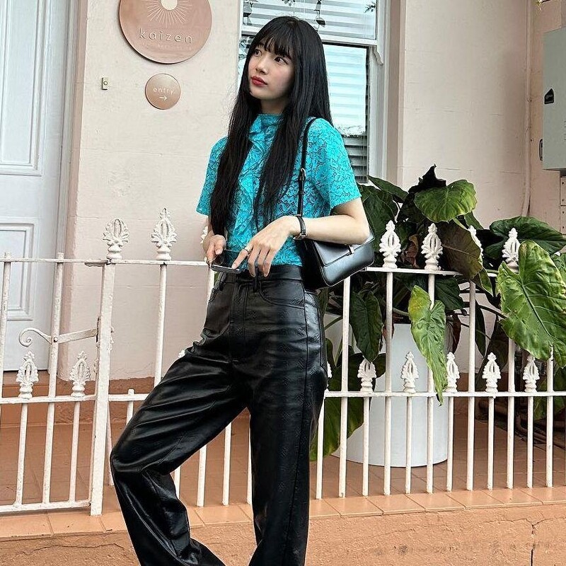 韩剧常见品牌 Joy Gryson 的 Tribeca 包款,虽然整体轮廓偏经典,但高品质的皮革、极简翻盖设计,耐髒的黑色,颇有都市氛围,绝对是都市丽人通勤上班、日常约会逛街的首选。想要更有个性,可以学秀智穿上皮裤,以跳色上衣做出变化。