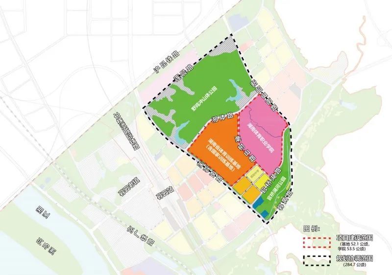 项目拟采用一次立项,分两期进行建设:计划2028年上半年完成一期建设,实现湖南体育职业学院以及4个训练中心(举重、摔柔跆、羽乒、射击4个训练中心,目前均位于湖南体育职业学院内)的搬迁;2030年全部建设完成。