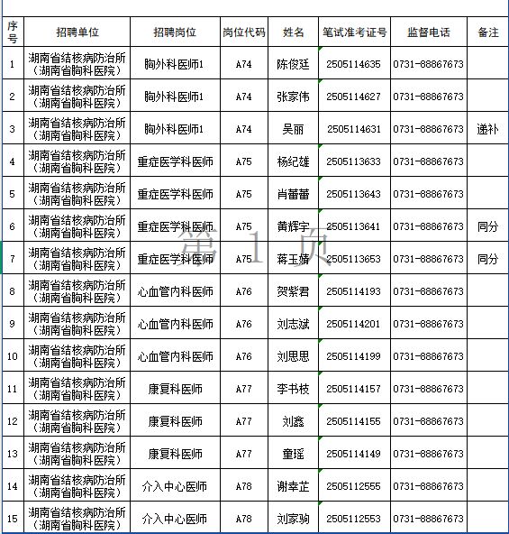 湖南省结核病防治所(湖南省胸科医院)2025年公开招聘入围面试和实际操作能力测试人员名单:
