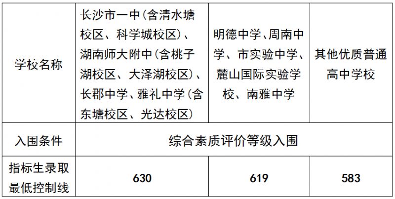 (二)综合素质评价录取要求。高中学校招生录取时,报考长沙市一中(含清水塘校区、科学城校区)、湖南师大附中(含桃子湖校区、大泽湖校区)、长郡中学、雅礼中学(含东塘校区、光达校区)、明德中学、周南中学、市实验中学、麓山国际实验学校、南雅中学等第一批次招生学校,要求考生综合素质评价结果达到4A1B及以上;报考第二批次招生学校中享有指标生招生资格的普通高中学校,要求考生综合素质评价结果达到3A2B及以上;报考其他公办普通高中学校,要求考生综合素质评价结果达到5B及以上。凡综合素质评价结果含有D等的考生,普通高中学校不予录取。
