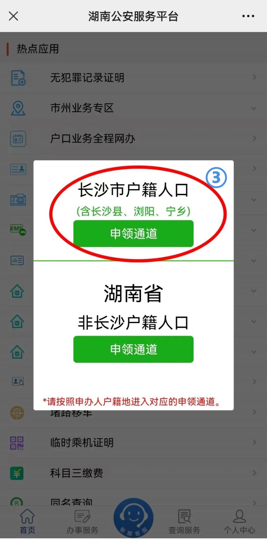 申请人可提前通过“长沙警事”微信公众号、“长沙公安”微信公众号、“我的长沙”APP等多种渠道进行网上预约,并按照预约办证时间前往预约办证点办理。